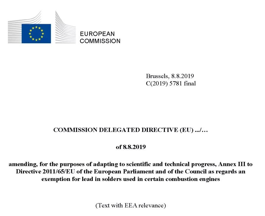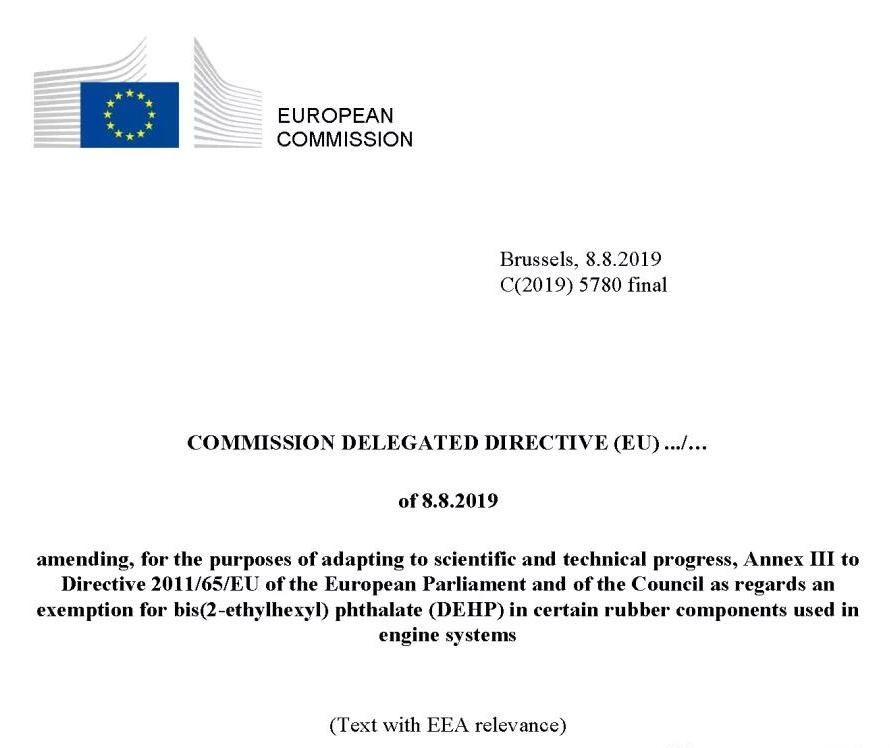 2019年8月8日,歐盟委員會通過了兩個Pack 14授權的指令,這些指令對歐盟指令2011/65/EU的附件III進行了修訂,該指令涉及限制在電氣和電子設備中使用某些有害物質。該指令將于其在《歐