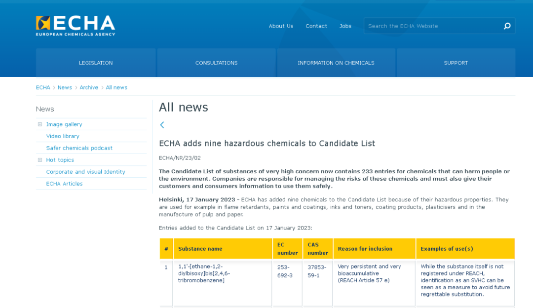 官網地址:https://echa.europa.eu/-/echa-adds-nine-hazardous-chemicals-to-candidate-list